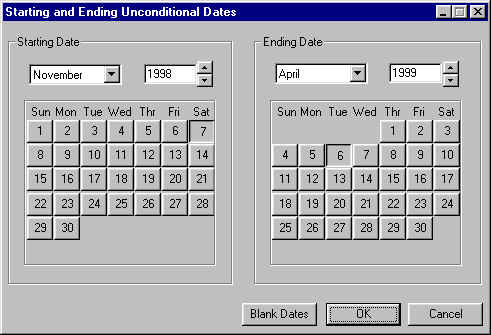 This calendar will prevent you from accidentally entering a date that does not exist. Click the Blank Dates if you do not want dates to form part of your search criteria.